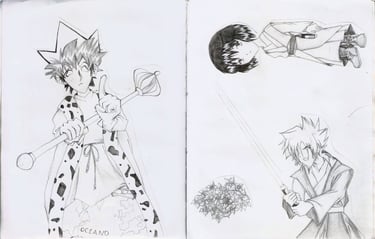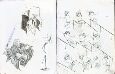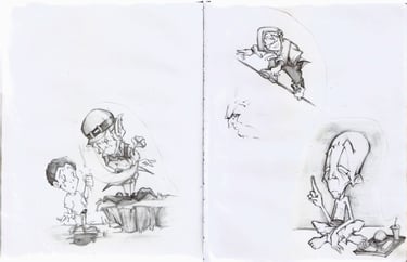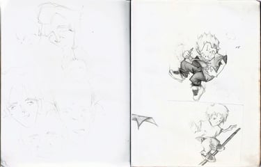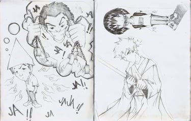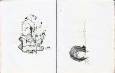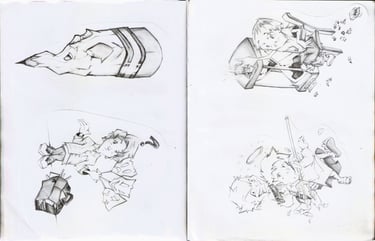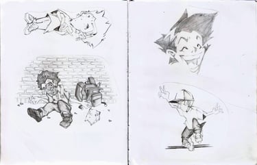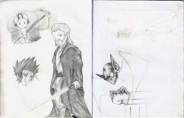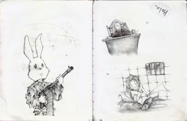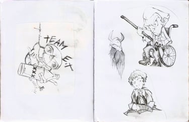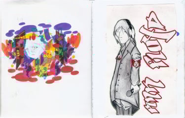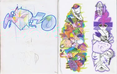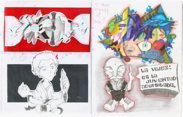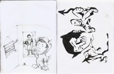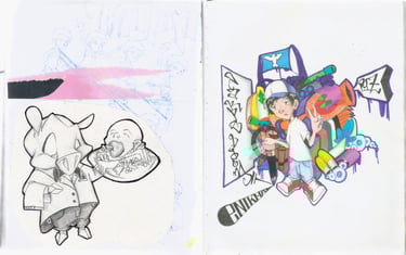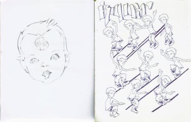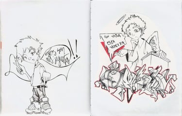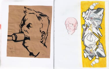 2002 drawings reflecting an early interest in street art, music, movies, comics, and political opinion.