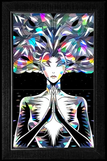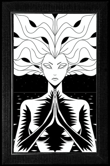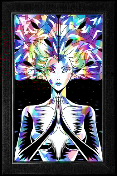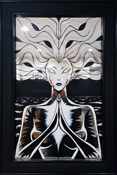 Black and white acrylic painting on a mirror exploring reflection and perception.